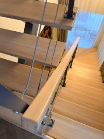 Лестница была создана на двух косоурах в связи с пожеланиями заказчика. Комбинированное ограждение было сделано из нержавещей стали и стекла.