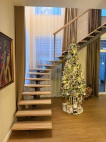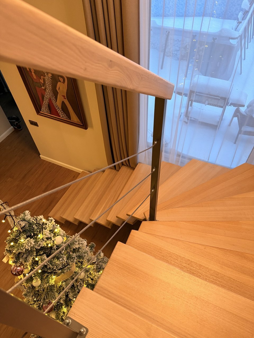 Первая лестница с забежными поворотными ступенями, все ступени выполнены из цельноламельного ясеня, обработаны и затонированны легкой светлой патиной по выбору заказчика. Ограждения с 3 рядами троссов, закрепленных с помощью троссодержателей. Вторая лестница аналогичная прямая на третий этаж. Цвет косоура сделан в цвете антрацит с молотковым эффектом.