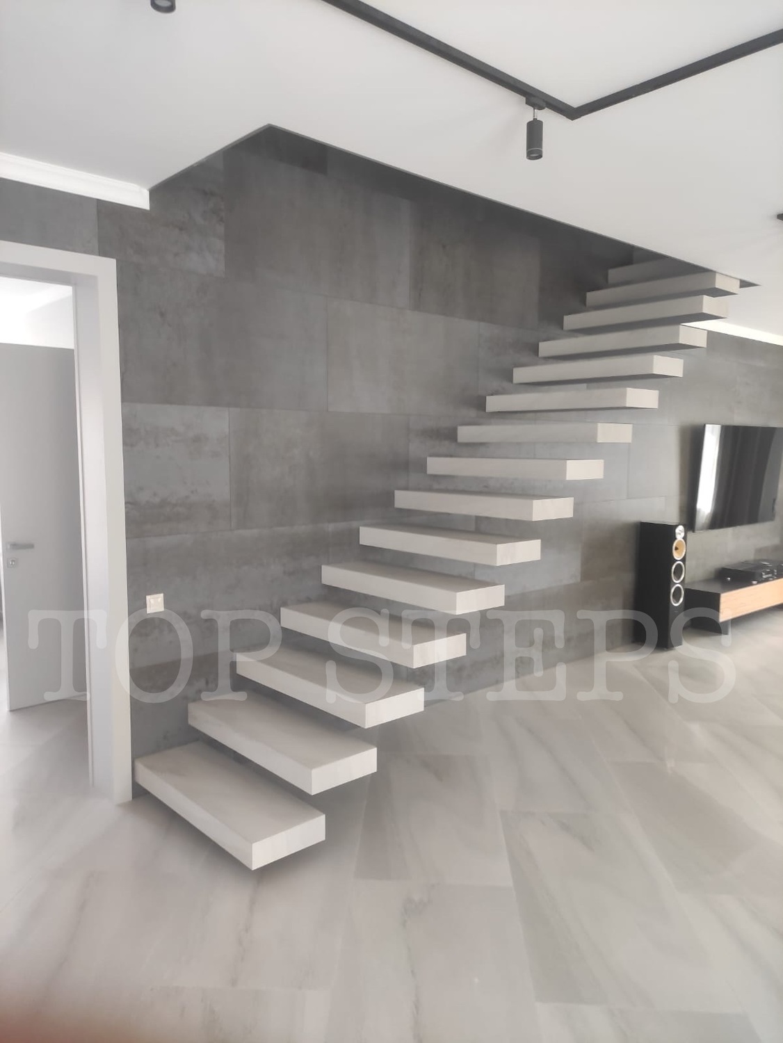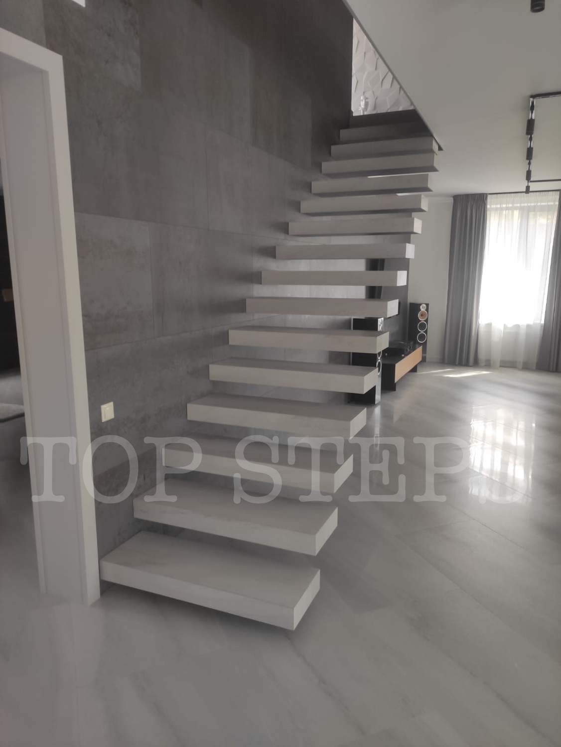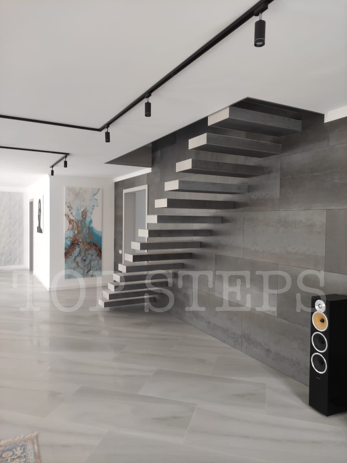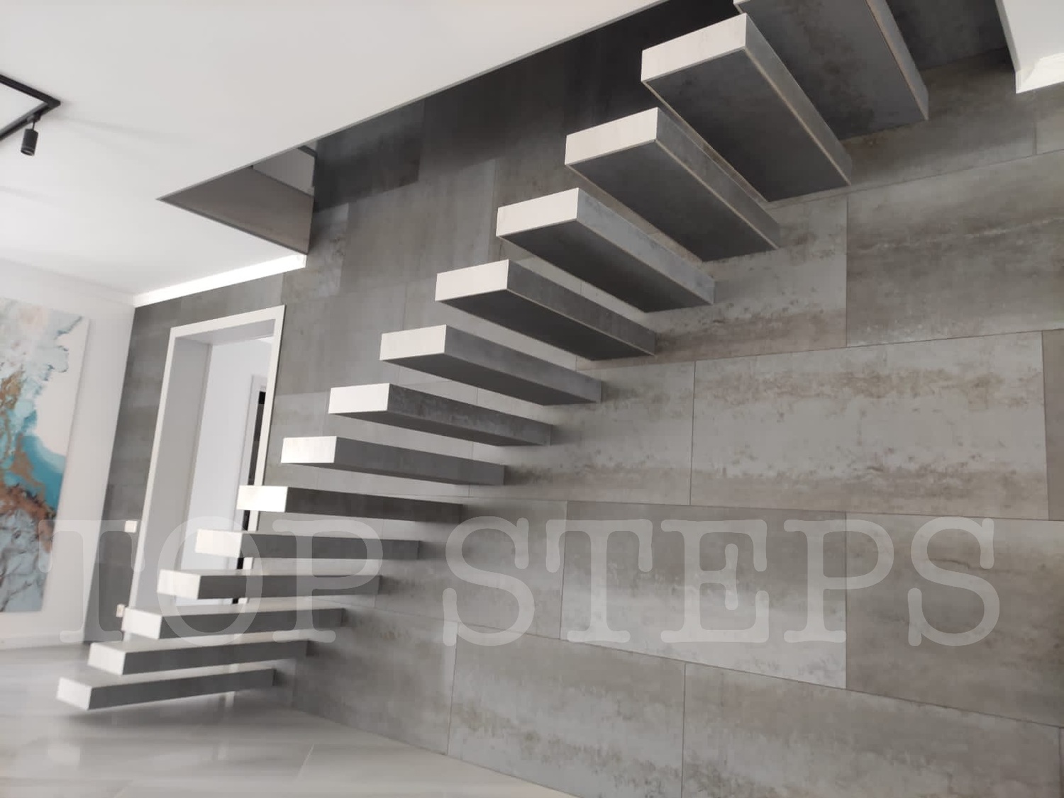 Консольная лестница — это «парящая» конструкция, у которой ступени крепятся только с одной стороны к несущей стене, создавая эффект легкости и невесомости, поскольку нет видимого каркаса и опор снизу, а пространство под лестницей остается свободным. Она выглядит как будто ступени "выходят" из стены, что идеально подходит для современных интерьеров и экономит место.