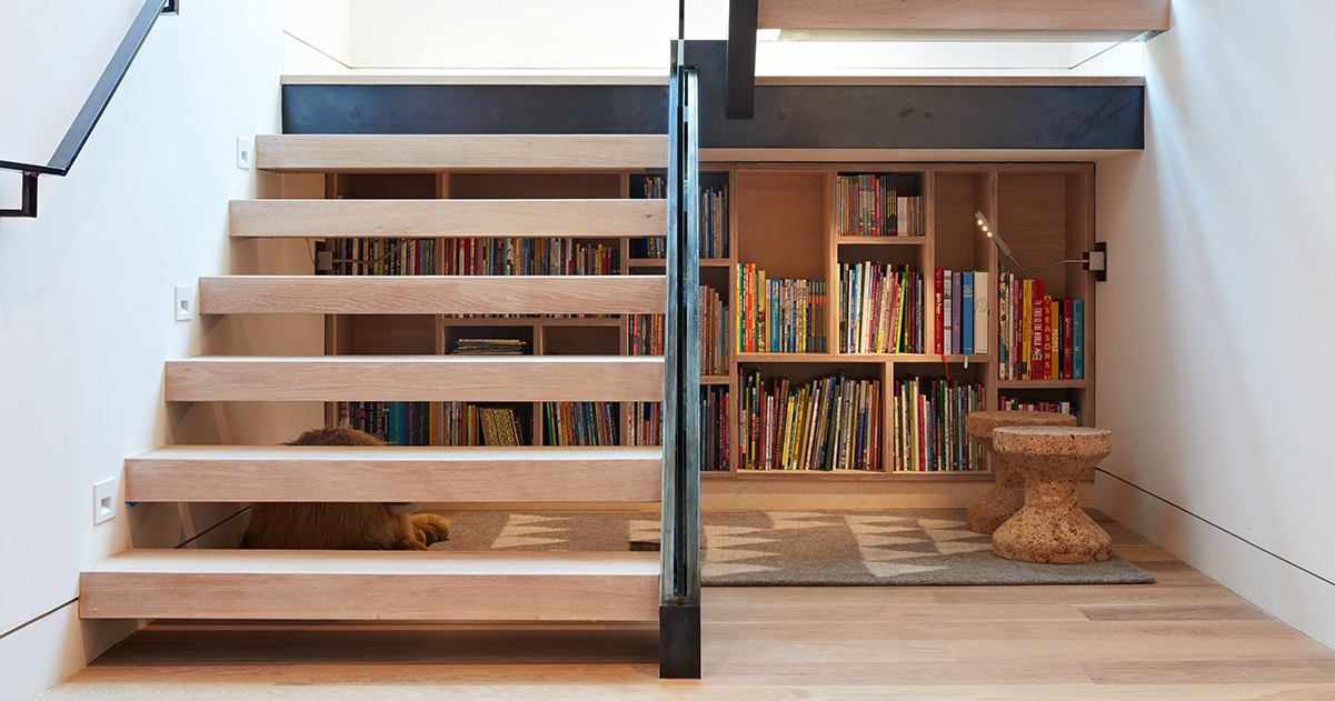Особенно гармонично такая лестница вписывается в современный интерьер. Кроме того, она не нагружает пространство и не препятствует распределению естественного света по всей комнате.